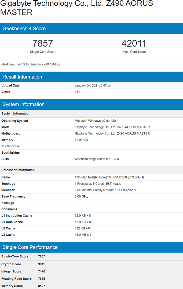在Geekbench跑分数据库中,我们找到了还未发布的11代桌面酷睿处理器的跑分信息。 其中i7 11700K Geekbench 跑分如下: